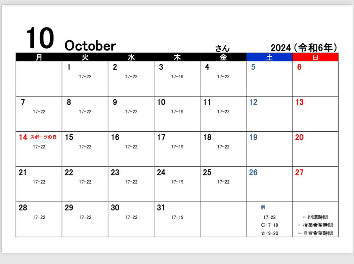 10月の開校カレンダーを投稿します!!