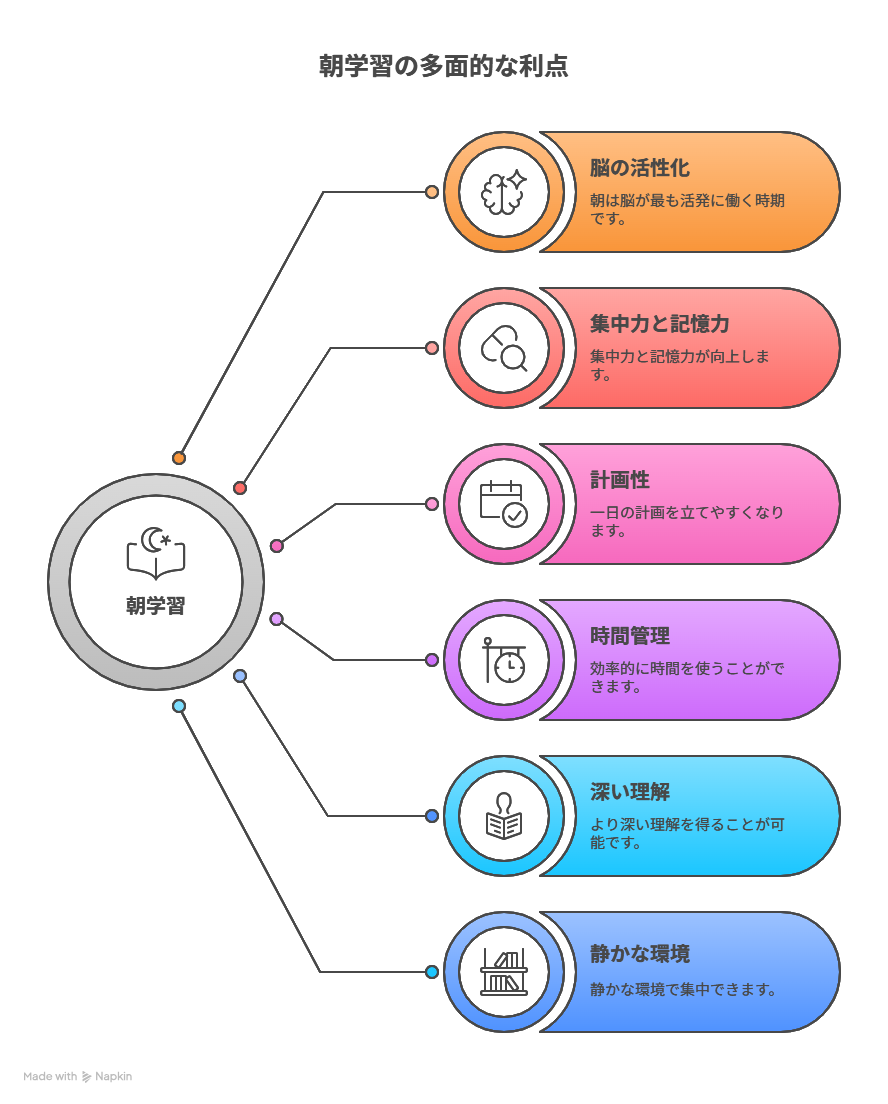 俺塾です✨✨ 「土日は朝から学習なんてできないよ。。。」 この習慣がいかにもったいないか伝えます!! 画像にある通り、これだけの朝学習する利点がこれだけあります。 昔から伝