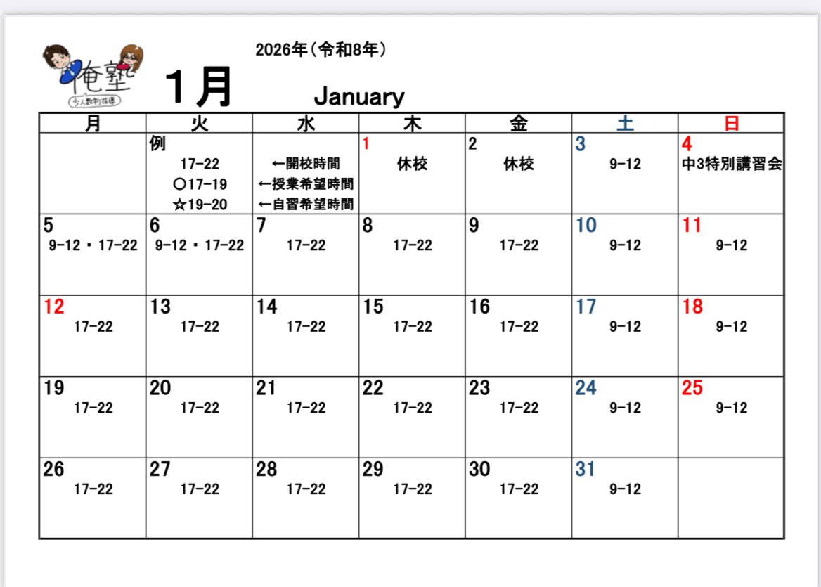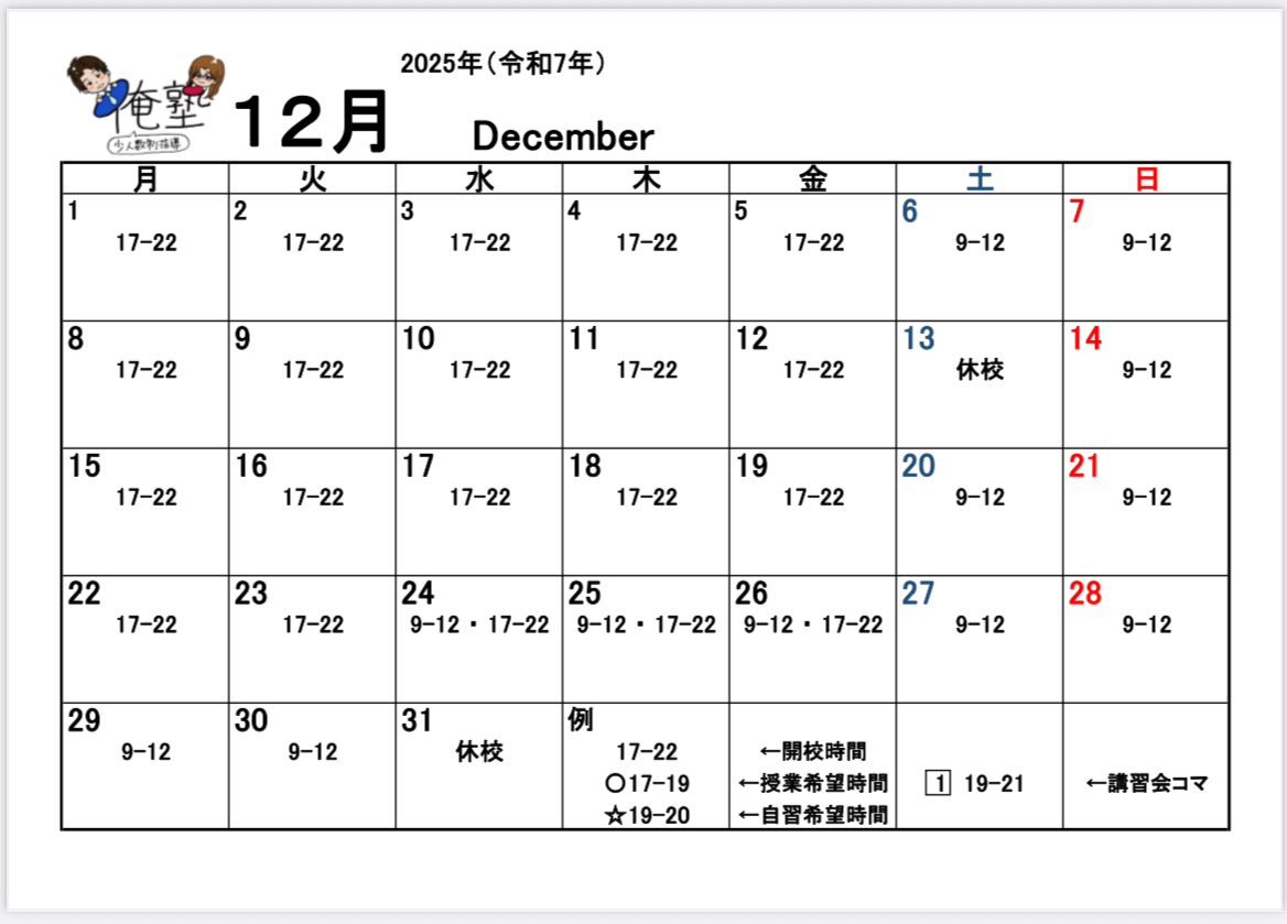 俺塾です✨✨ 12月開講カレンダー✨✨ 年末は30日までやっており、年始は3日からスタート!! 冬休みもガッツリやって学習習慣を整えます
